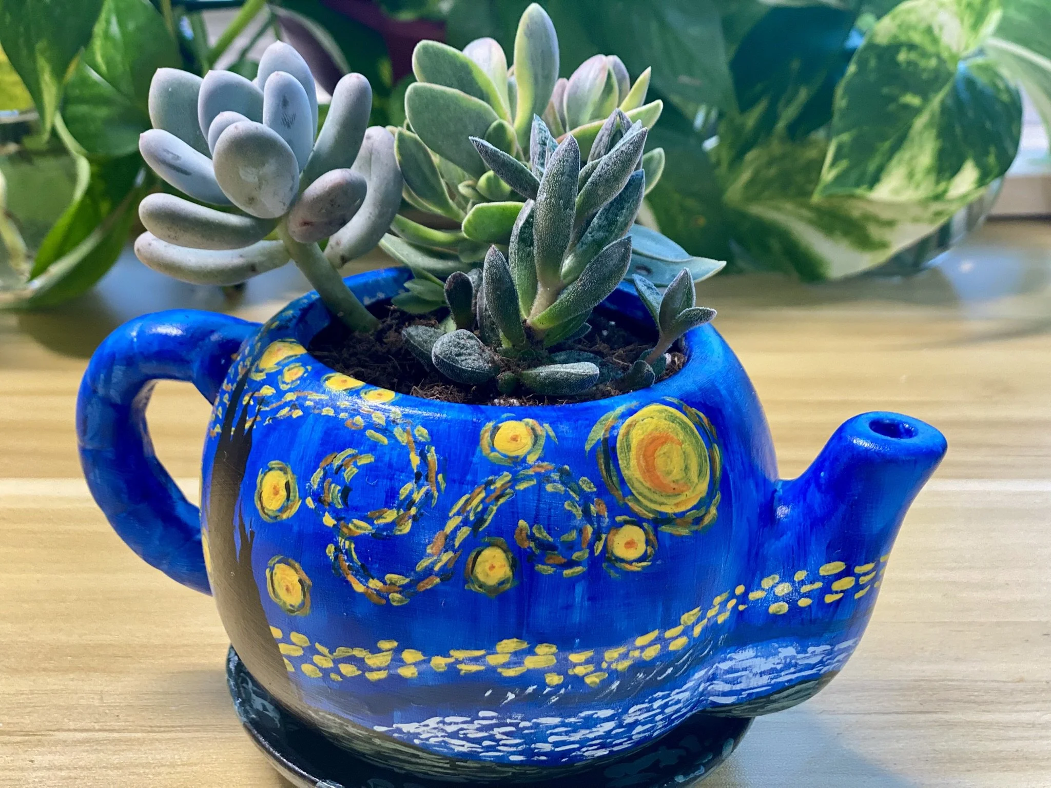 Unleash your creativity at our Starry Night Teapot Painting Workshop! Perfect for all skill levels, this event will guide you step-by-step through recreating Van Gogh's iconic masterpiece on a teapot planter. No experience? No problem—our instructors will break the process into easy-to-follow steps, making it fun and achievable for everyone. Once your artwork is complete, we'll turn your teapot into a charming planter by potting succulents together. You'll leave with a beautiful, functional piece of art and a new skill to show off